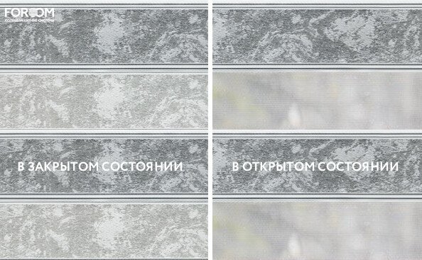 Полотно ткани, состоит из чередующихся горизонтальных полос – прозрачных и непрозрачных. Изменяя положение этих полос относительно друг другу, можно создать целых 3 режима регулировки светом. Например, чтобы в помещении стало светлее, нужно расположить прозрачные полосы друг напротив друга. Если разместить прозрачную и непрозрачную полосу параллельно друг другу, то можно добиться практически полного затемнения.