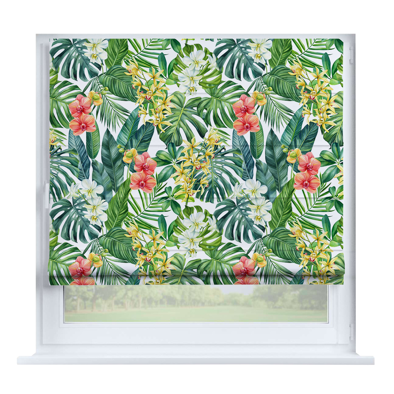 Римская штора на створку «Листья монстеры», карниз верёвочный